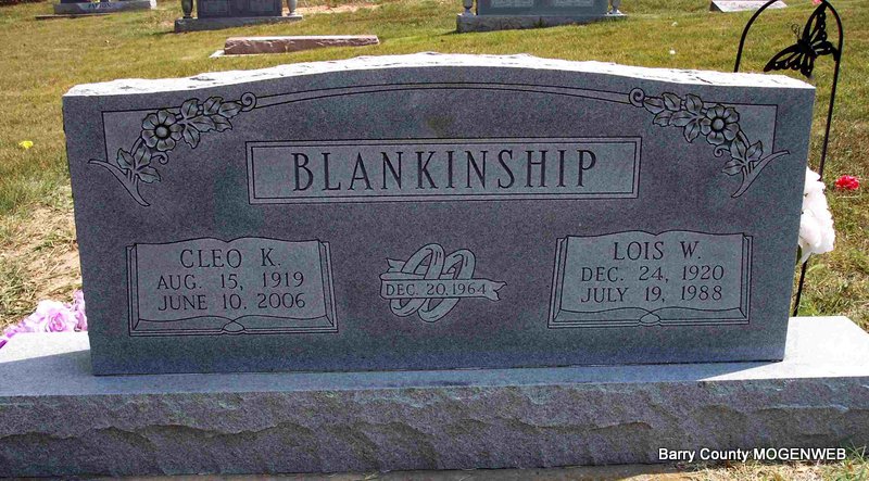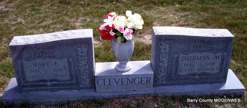 | CLEVENGER, Mary E. (HORTON) | Nov. 2, 1896 | Mar. 1, 1978 | SSW: Sherman M. - Research Note: Mary Horton married Sherman Clevenger on Oct. 8, 1915 in Barry Co., MO. | MO Marriage Records Phyllis Long Photo Diana Cope |