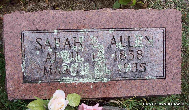 Research Note: Sarah Ellen was the second wife of Rev. Levi Allen (he is buried at McCormick Cemetery). They married on 25 April 1889 in Barry Co. at the home of the bride. Her parents were Samuel Matthew and Mary Elizabeth (Johnson) Bailie. - Sarah E. Allen was born Apr. 13, 1858. She departed this life Mar. 26, 1935, age 75 years, 11 months and 8 days. She was married to Elder Levi Allen and to this union seven children were born. Four are dead. She leaves three children, Delmer C. Allen, Elbert F. Allen, Mrs. Ida May Eubanks and a host of friends to mourn her passing. | Barry Co. Marriages, 1900-1930 Federal Census Michael Stone Newspapers.com Phyllis Long Photo Diana Cope |