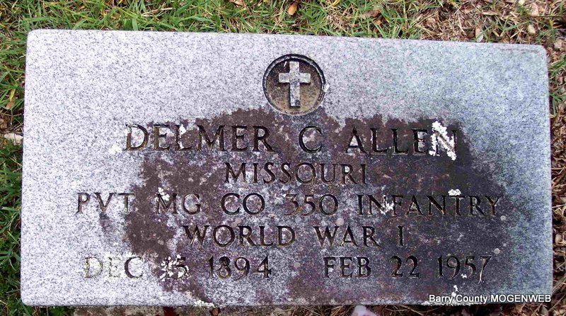Inscription: "MISSOURI PVT MC CO 350 INFANTRY WORLD WAR I" - Research Note: Delmer Clarence was the son of Rev. Levi Allen buried at McCormick Cemetery and Sarah Ellen (Bailie) Allen. Elbert F. Allen of Jenkins, MO was the informant on the death certificate. | 1900-1930 Census, WWI Draft Cards Michael Stone Death Certificate Phyllis Long Photo Diana Cope |