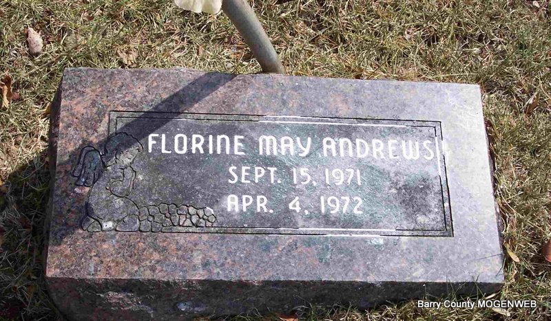 | ANDREWS, Florine May | Sept. 15, 1971 | Apr. 4, 1972 | Research Note: Florine May Andrews, 6 month old daughter of Mr. and Mrs. Roy Leon Andrews, of RR 1, Jenkins, MO died at 9:30 a.m. Tuesday in Cox South Hosp., Springfield, after being in the hospital three weeks. Besides her parents, survivors include the maternal grandparents, Mr. and Mrs. Dan Foster, of Jenkins; the paternal grandparents, Mr. and Mrs Bill Andrews of Siloam Springs, AR; the paternal great grandmother, Mrs. Florine Tracy, of CA. | Newspapers.com Phyllis Long Photo Diana Cope |