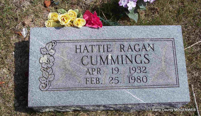 | CUMMINGS, Hattie (RAGAN) | Apr. 19, 1932 | Feb. 25, 1980 | Research Note: Hattie's first husband was Charles R. Ragan. Hattie C. Ragan, age 41 of Joplin, Jasper Co., MO, married Colonial W. Cummings, age 42 of Picher, Ottawa Co., OK, on June 29, 1974 in Butterfield, Barry Co., MO. | MO Marriage Records City Directories Phyllis Long Photo Diana Cope |