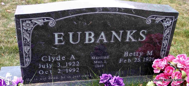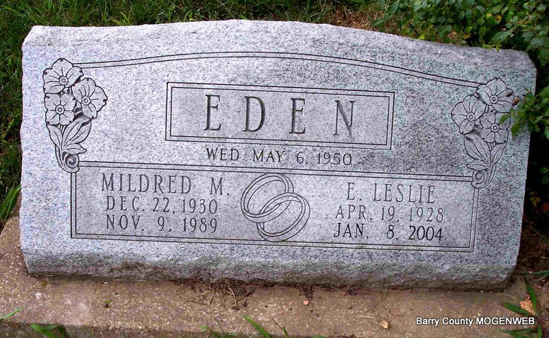 SSW: Mildred M. - Inscription: "Married May 6, 1950" - Research Note: Son of Uel and Cletus (Edgmond) Eden. His wife, Mildred Eden, preceded him in death. He second married Shirley Eden. He was preceded in death by one brother, Don Eden. | Monett Times Jan. 12, 2004 Mary Homesley Photo Diana Cope |
