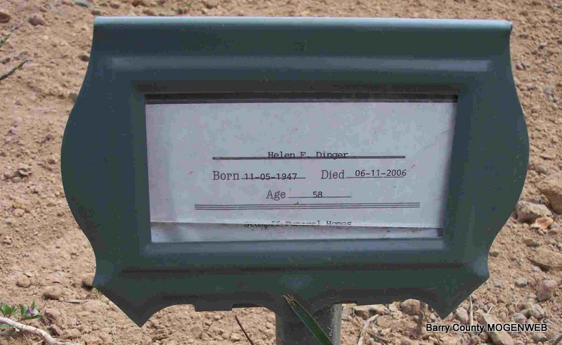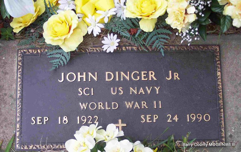 Inscription: "US NAVY - WORLD WAR II" - Research Note: Served 33 years in Armed Forces including Navy, Coast Guard, Army Reserves and National Guard. Son of John and Flossie (Allen) Dinger. Born at Wamego, Pott Co., KS. Married Edna Erna Hasenbank on January 23, 1943. He was a machinest for Clark Industries in Monett, MO before he retired. He had cancer and had been ill for 6 months. | Obit findagrave.com Phyllis Long Photo Diana Cope |