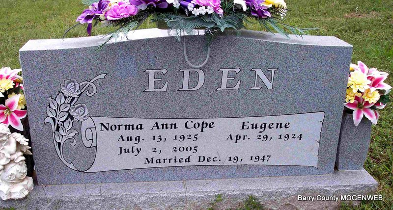 SSW: Norma Ann Cope - Inscription: "Married Dec. 19, 1947" - Research Note: Son of Emory M. Eden and Nettie L. Swearingen. Gene retired in 1986 as a Construction Foreman with Missouri Gas Energy. He was a Mason, a member of the Monett VFW Post 4207 and the Verona Lions. On December 19, 1947, he married Norma Ann Cope in Springfield, Missouri. She preceded him in death on July 2, 2005. His grandson, Nicholas Cassidy Hembree, two brothers, Harold and Lynn Eden, and his son-in-law, Berton Maddocks, also preceded him in death. | Census Crafton-Cantrell Funeral Home Phyllis Long Photo Diana Cope |