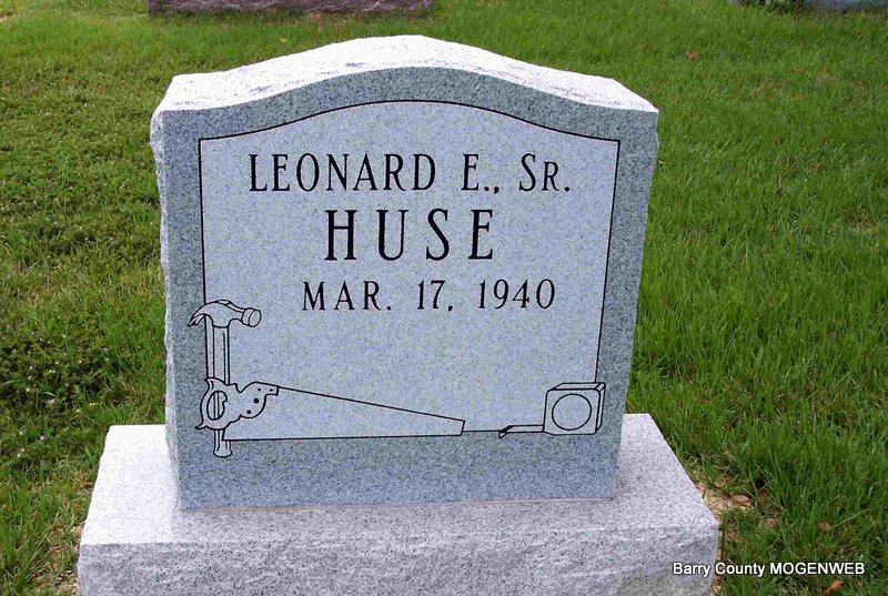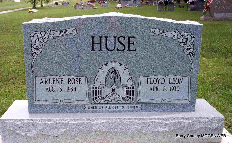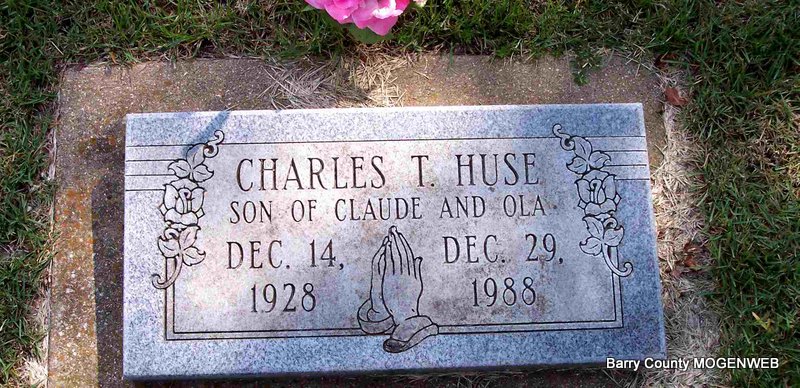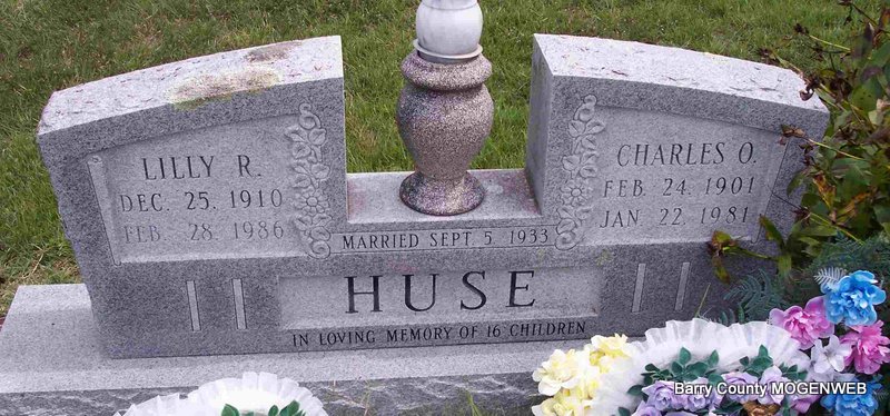 | HUSE, Charles Opal | Feb. 24, 1901 | Jan. 22, 1981 | SSW: Lilly R. - Inscription: "Married Sept. 5, 1933 - In Loving Memory of 16 Children" - Research Note: Son of Charles Hamilton Huse, Jr. and Mira Belle Stockton. - 1930 Census, Jenkins, Barry, Missouri - Opal C. Huse, age 29 with first wife Catherine J. (Perriman) Huse, age 15. At age 32, Opal Huse married Ruth O'Dell, age 22, on Sept. 5, 1933 in Jenkins, Barry Co., MO. | MO Marriage Records Census Phyllis Long Photo Diana Cope |