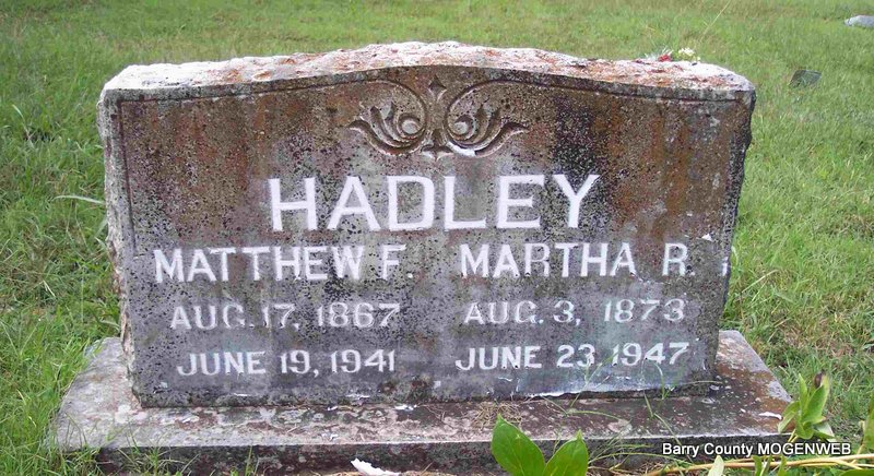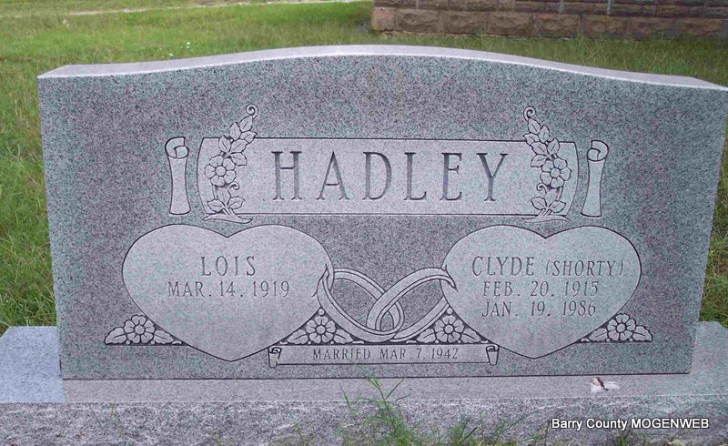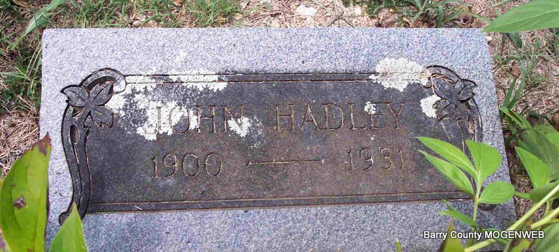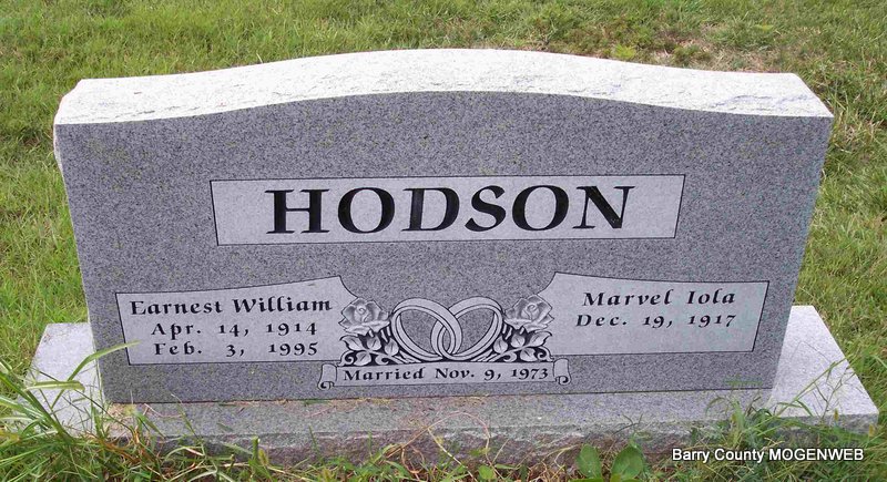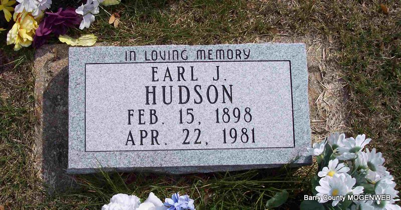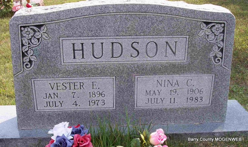 | HUDSON, Vester Edward | Jan. 7, 1896 | July 4, 1973 | SSW: Nina C. - Research Note: Son of James W. Hudson and Sarah Hannah Doty. He first married Nellie M. Periman, second, Nina Carmen Davis. - Vester Hudson, 77, Jenkins, died last Wednesday at Cox Medical Center, Springfield, where he had been a patient for the last two weeks, following a long illness. Mr. Hudson was born Jan. 7, 1896, in Barry County, and was a retired carpenter and contractor. He married Nina Davis, who survives, May 7, 1932, at Aurora. Other survivors include a daughter, Mrs. Mabel Clark, Verona; two stepdaughters, Mrs. Billie Hamilton, Indianapolis, Ind., and Mrs. Uldine Pattyson, Marionville; two stepsons, Clyde Scott and Ralph Scott, both of the state of Washington; three brothers, Earl Hudson and Walter Hudson, both of Kansas City, and Harl Hudson, Verona; four grandchildren, 16 step grandchildren, 12 great-grandchildren and seven great-step grandchildren. Services were held last Friday at Culver Funeral Home here with the Rev. Frank Eaton officiating. Burial was in Clio Cemetery, near Jenkins | Cassville Republican Phyllis Long Photo Diana Cope |
