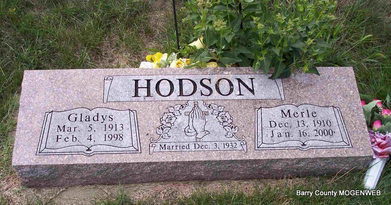 SSW: Vergia - Inscription: "Married July 2, 1907" - Research Note: Son of Alexander Hudson born Cato, MO and Rebecca Jane Doty born Barry Co., MO. Mrs. Clint Blythe of Cassville, MO was the informant on the death certificate. - Cassville Republican, June 1, 1944 - John Hudson who had been critically ill for several weeks was taken to the St. Vincent's Hospital Tuesday of last week, and died there Friday morning, May 26th. He had been treated at a Springfield hospital, prior to being removed to the St. Vincent's hospital. His body was received by the Culver Funeral service here in Cassville and prepared for burial. Mr. Hudson was 55 years old. He had lived most all his life in the Jenkins community. Funeral services were delayed to give some of the children time to get home. It is to be held today, Thursday, at Clio, with the Culver undertakers in charge. - Another Stone | Death Certificate Online Obit Phyllis Long Photos Diana Cope |