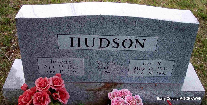 SSW: Jolene - Inscription: "Married Sept. 11, 1954" - Research Note: He was a son of Frank and Cora (Bennett) Hudson. Husband of Cherria "Jolene" Beaver. Father of Joe David and Jason. Served in the Korean Conflict from 1952 to 1954. Twin to Jim Max. - Another Photo | Barry Co. Advertiser Mar. 1, 1995 Photos Diana Cope |