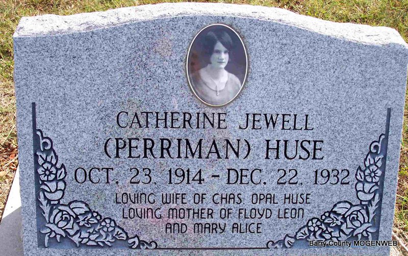 | HUSE, Catherine Jewell (PERRIMAN) | Oct. 23, 1914 | Dec. 22, 1932 | Inscription: "Loving wife of Charles Opal Huse - Loving mother of Floyd Leon and Mary Alice" - Research Note: Died of auto-infection-flu. Wife of Charles Huse. Father H. L. Perriman, Mother was Ethel Wheeler, both born in Barry Co., MO. - Photo on Stone | King Funeral Home Jay Trace Photos Diana Cope |