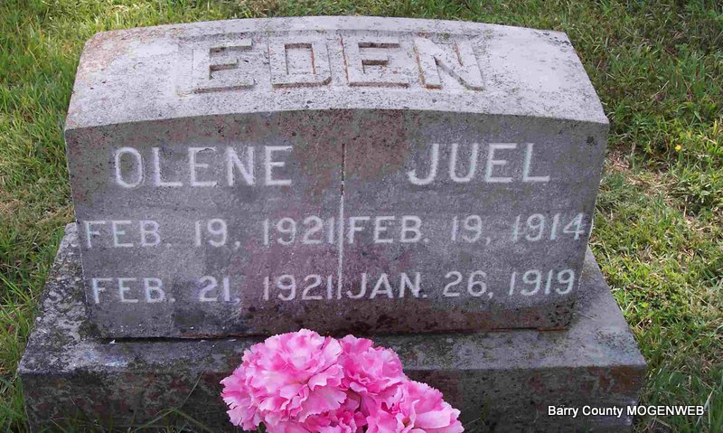 | EDEN, Juel | Feb. 19, 1914 | Jan. 26, 1919 | SSW: Olene - Research Note: Son of James Jackson Eden and Sarah Melvina Evans. | Note Phyllis Long Photo Diana Cope |