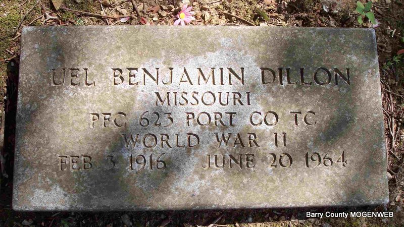 Inscription: "MISSOURI PFC 623 PORT CO TC WORLD WAR II" - Research Note: Usual residence was Jenkins, Barry Co., MO. Son of Rosa (Foster) and James Watkin Dillon. Never married according to the death certificate. | Note Marie DeMoss AR Death Certificate Phyllis Long Photo Diana Cope |