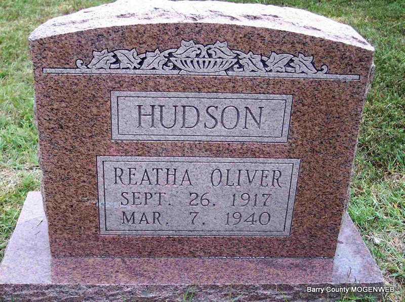 Research Note: Wife of Lon Hudson. Daughter of J. T. Oliver born KS and Carrie Newton born OH. Her husband, Lon, of RR 2, Cassville, MO was the informant on the death certificate. Influenza was the cause of death. - Lon second married Opal Foster. He died in 1999 and is buried at Old Carney cemetery. - Cassville Republican, March 14, 1940 - Mrs. Reatha Eileen Hudson, wife of Lon Hudson, died at the home of her parents, Mr. and Mrs. J. T. Oliver near the Sparks school house Thursday night, March 7. Death was due to intestinal flu. Mrs. Hudson was only 23 years old. When a girl she was a student in the Cassville High School and had lots of close friends among the student body. Besides her husband and parents, she is survived by two children; Jewell, three years old and Rochelle, one year old. On April the 21st, 1935, she was united in marriage to Lon Hudson of Jenkins, Mo. To this union were born two children, Betty Ann, age 3 and Rochelle, age 1. She was a kind affectionate daughter, a loving wife and mother, and a friend, having a smile and cheerful word for everyone. | Death Certificate Obit Phyllis Long Photo Diana Cope |