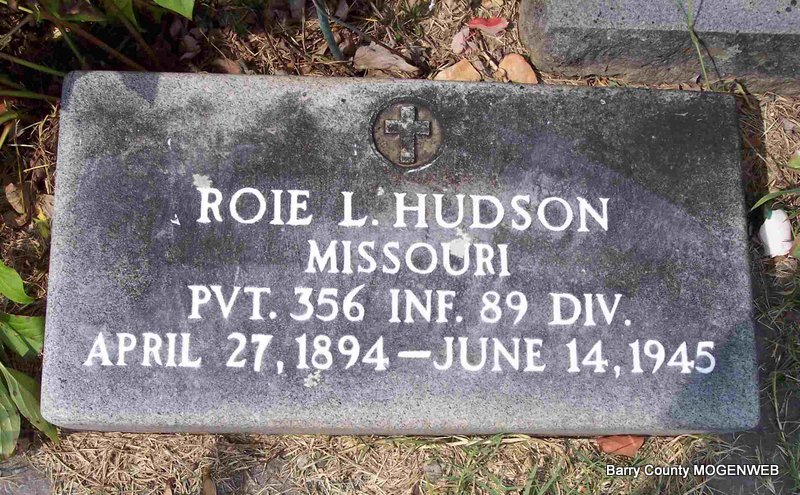 SSW: Leona R. - Research Note: Son of Alexander and Rebecca (Doty) Hudson. He was the husband of Leona Avero, married Sept. 24, 1920. Father of Dorothy, Alice and Ray. Veteran of World War I. - Another Photo - Military Stone - Inscription: "MISSOURI PVT 356 INF. 89 DIV" | Cassville Republican June 21, 1945 Photos Diana Cope |