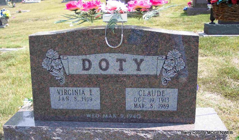SSW: Claude - Inscription: "Married Mar. 9, 1940" - Research Note: She was the daughter of Joseph and Mae (Evans) Gamble. Virginia was united in marriage to Claude Doty on March 9, 1939. They worked the farms and raised their five children in Barry and Stone Counties settling in Ponce de Leon. She loved dogs and has had one as a constant companion for the past 30 years. She was preceded in death by her husband, Claude, on March 8, 1989; her parents; seven siblings, Howard Gamble, Jerry Gamble, Steve Gamble, Ruth Owen, Doris Gamble and Shirley Grider; and a set of twin great-grandchildren. | Springfield News-Leader Phyllis Long Photo Diana Cope |