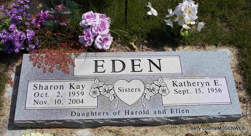 SSW: Sharon Kay - Inscription: "Sisters - Daughters of Harold and Ellen" - Research Note: She was the daughter of Harold James and Ellen Marie (Winzer) Eden. Kathy was a 1975 graduate of Aurora High School. She worked for McWade Jewelers in Aurora for over 20 years until they closed. She then worked for several years in the bakery at Price Cutter's in Aurora. Her parents, Harold and Ellen, two brothers, Timmy and Kevin Eden and sister, Sharon Eden, preceded her in death. | Crafton-Cantrell Funeral Home Phyllis Long Photo Diana Cope |