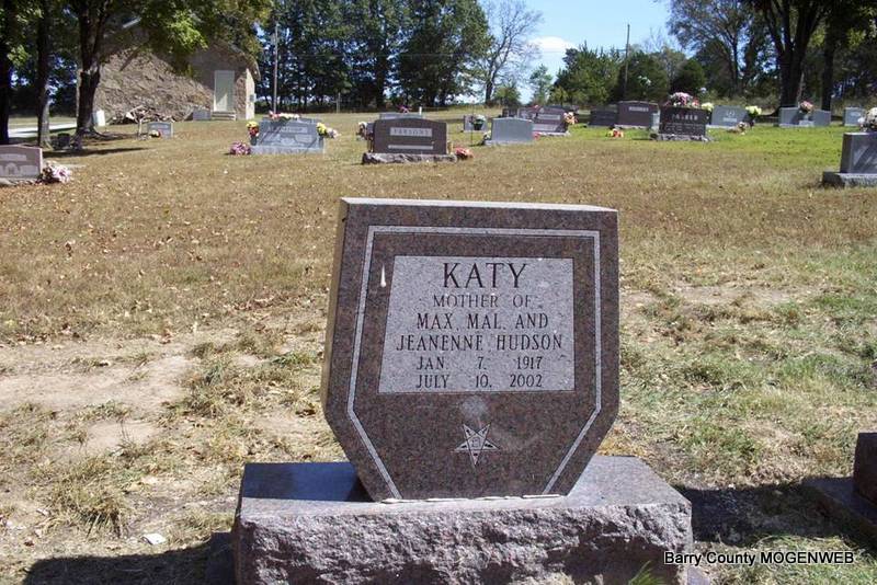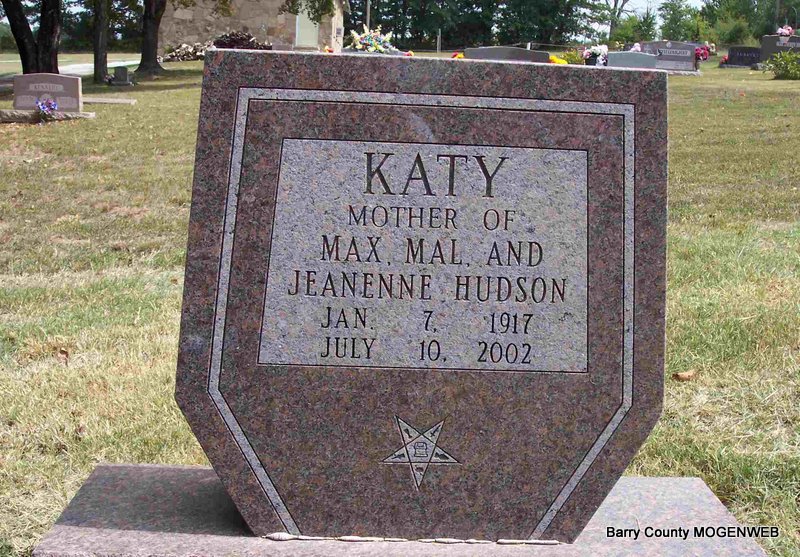 Inscription: "Mother of Max, Mal and Jeanenne Hudson" - Research Note: Katy Hudson Doty, 85, of Aurora, died yesterday, July 10, at her home. No services are planned and the body will be cremated under the direction of Fohn Funeral Home of Cassville. Visitation will be from 5 to 8 p.m. Saturday, July 13, at her home in Aurora. Memorials may be made to Quality Hospice in Cassville. Wife of Gene R. Hudson. - Second husband was Mr. Doty. Daughter of Frank Miller and Margaret Elizabeth Slay. - Another Photo | Monett Times SS Claims Index Phyllis Long Photos Diana Cope |