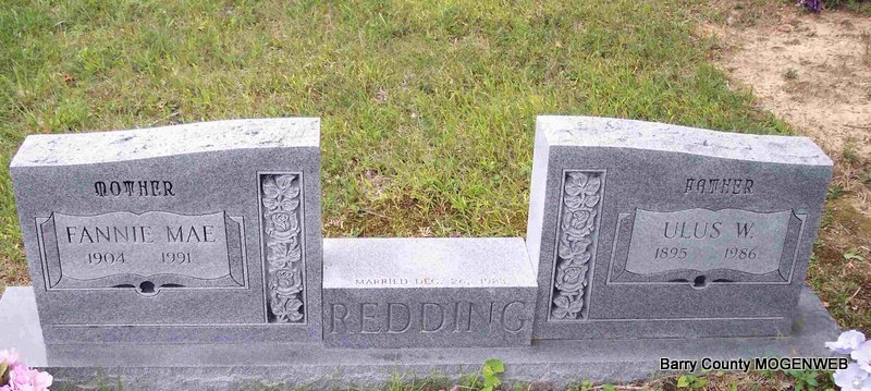SSW: William Uel "Pete" - Inscription: "Married Oct. 16, 1937" - Research Note: She was the daughter of Roy H. "Levi" and Wilhelmina Jane (Phillips) Madison. On October 16, 1937, in Oak Ridge, Missouri, she was united in marriage to William Uel "Pete" Redding, who preceded her in death on February 25, 2002. Also preceding her in death were her parents; one sister, Pearl Seago and three brothers, Elzie, Kenneth and Leslie Madison. "Dot" as many called her attended Longfellow School in Coffeyville, Kansas. The depression began and the factories were only open one or two days a week so a person couldn't make a living that way. Dorothea's parents owned some land near Hailey, Missouri, so when she was fifteen they moved there and farmed, raising cattle and chickens to sell cream and eggs. Dot's hobbies were cooking, knitting and crocheting, her hands were never idle. | Fohn Funeral Home Phyllis Long Photo Diana Cope |