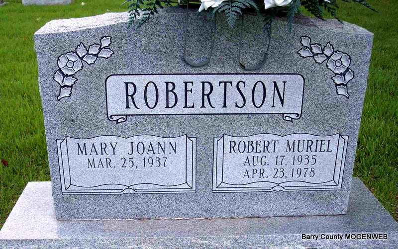 | ROBERTSON, Mary Joann (ROSS) (PRITCHARD) | Mar. 25, 1937 | Nov. 5, 2010 | SSW: Robert Muriel - Research Note: Daughter of Osba Ross and Opal Ann Smith. At age 19, she first married Ted Wayne Pritchard, age 21, on Sept. 7, 1956 in Aurora, Lawrence Co., MO. | MO Marriage Records Census SSDI Phyllis Long Photo Diana Cope |