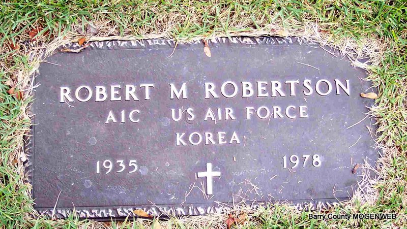 | ROBERTSON, Robert Muriel | Aug. 17, 1935 | Apr. 23, 1978 | SSW: Mary Joann - Research Note: Son of George Washington Robertson and Grace Velta Wheeler. - Military Stone - Inscription: "AIC US AIR FORCE KOREA" | Headstone Note Marion C. Smith Photos Diana Cope |