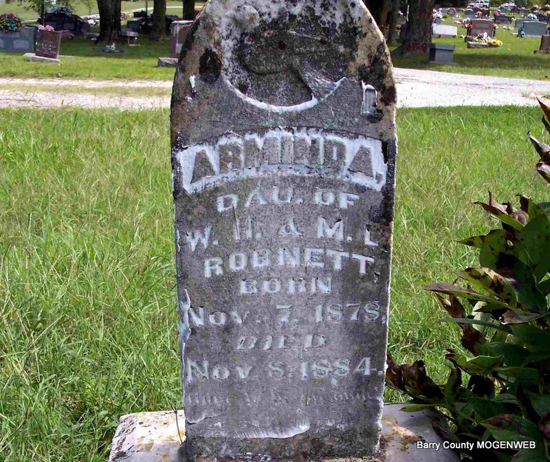 | ROBINETT, Amanda | Nov. 7, 1878 | Nov. 8, 1884 | Inscription: "Dau. of W. H. & M. L." - Research Note: Daughter of William Harrison Robinett and Margaret Louisa Bingham. - Stone From distance | Census Phyllis Long Photos Diana Cope |