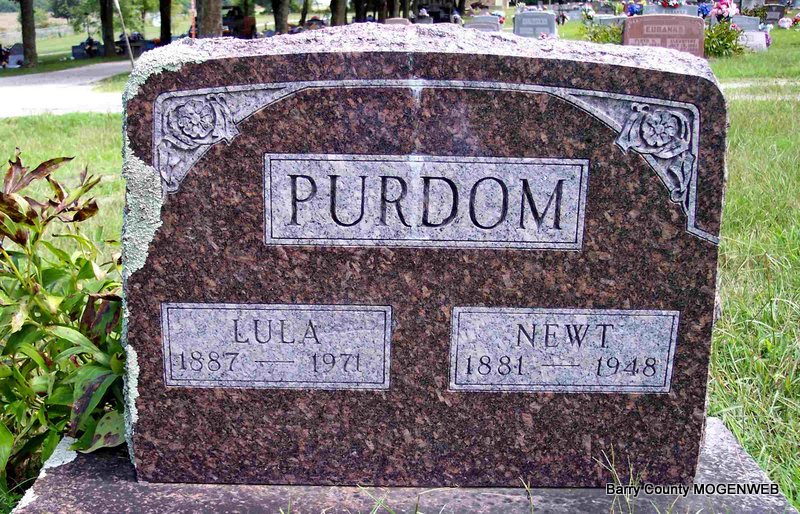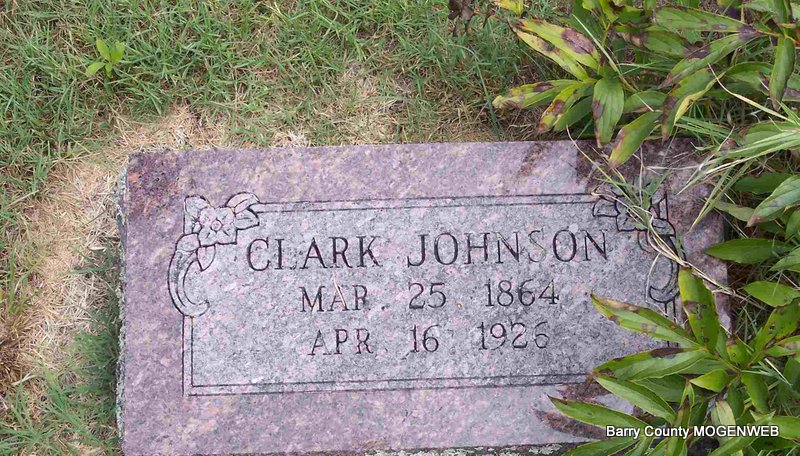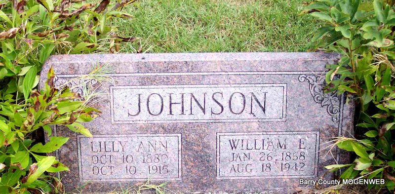 SSW: William E. - Research Note: Daughter of Jonathan Eden and Matilda Stockton. Lillie Ann Eden, age 19, married William E. Johnson, age 27, on Sept. 3, 1899 in Barry Co., MO. - October 21, 1915, Cassville Republican - Mrs. Lillie Johnson Dead: Mrs. Lillie Ann Johnson, wife of William Johnson, died at her home near Clio Saturday, Oct 9, of a complication of diseases, age 34 years, 11 months and 29 days. Mrs. Johnson was a daughter of Mr. and Mrs. John Eden of near Clio among our most highly respected citizens. While yet in her teens she was married to William Johnson and continued to live in this locality. She leaves a husband and two small sons, father and mother, two sisters and four brothers and a host of friends to mourn her loss. She expressed a willingness to go and be at rest. Funeral services were held at Clio Church, conducted by Rev. Spain of the Baptist Church. Interment was made in the Clio Cemetery. The bereaved have the sympathy of the people of the entire neighborhood. | Online Newspapers Census Phyllis Long Photo Diana Cope |