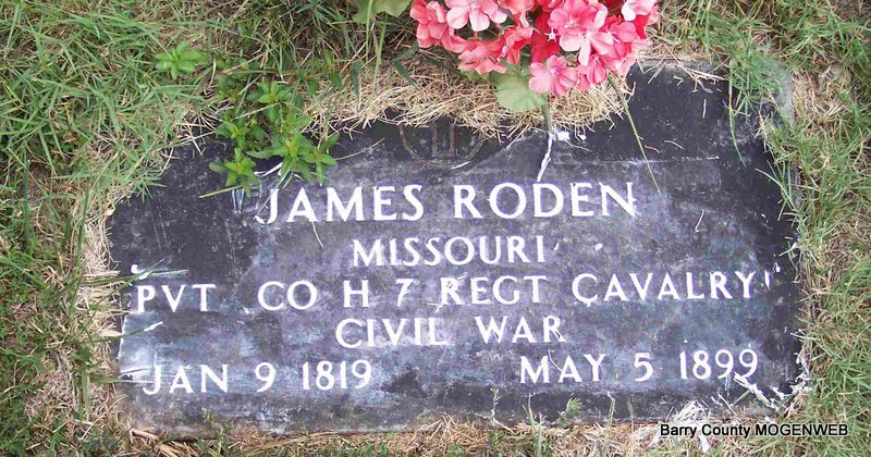 Inscription: "MISSOURI PVT CO H REGT CAVALRY CIVIL WAR" - Research Note: There is no one buried here - just a stone. He is probably buried in Corsicana Cemetery with his wife Nancy Matilda Fly. - Ted Roller's comments: I had told Jack Fly that the stone did not have a body under it using dousing rods. We followed up. Loren Roden knew that there were some CW soldiers found at Clio and he ordered a stone near Old Bob Town where James was known to live last with his wife. He had it placed where it stands as is, as a memory to James. I think this is just as good a placement as Corsicana as I have no prove otherwise. Jack Fly and Nancy are close friends and may have started the story further. The James Roden lived at Bethel area also and could be buried there? Someone may have proof of a burial at Corsicana?? He lived near Corsicana after the CW on 40 acres. I have the abstract. - Cassville Republican, May 11, 1899 - James Roden died at the home of his sister-in-law, Mrs. Samuel Bailie, in Mountain township. Born in Giles Co., Tennessee, he came to Barry County in the 1840's. He married three times. His first wife was a sister of Asher Fly of Jenkins, by whom he had five children. His second wife died on the Gasconade shortly after giving birth to twins. The babies were given to a neighbor woman and Mr. Roden went to war. A few years ago he looked up his twins. One had died and the other was doing well. His third wife was Miss Nancy Salmon, sister of Mrs. Samuel Bailie. | Note Ted Roller Online Obit Phyllis Long Photo Diana Cope |