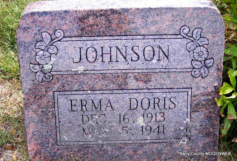 | JOHNSON, Erma Doris (BAILIE) | Dec. 16, 1913 | May 5, 1941 | Research Note: Cause of death-peritonitis and appendicitis. Age 27 years, 4 months, 19 days, first wife of Roy Johnson. Daughter of John Washington Bailie and Avana Baxter. | Census Phyllis Long King Funeral Home Jay Trace Photo Diana Cope |