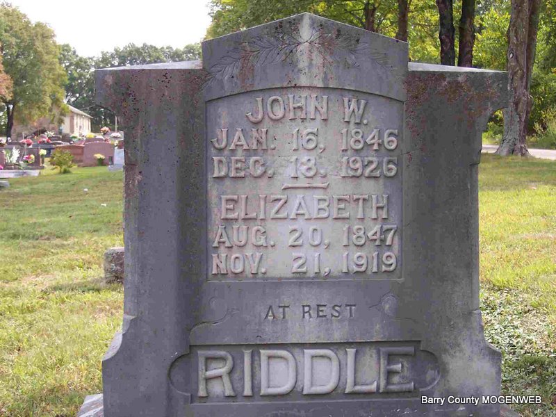 SSW: John W. - Research Note: Her death certificate reads that her father was John Terry, born in TN (father was not John Terry). Mother not named. Wesley Riddle of Jenkins, MO was the informant. Place of birth gives MO but all census say AR. Extensive research and family letters say that Elizabeth was the daughter of Francis Martin Terry and Mary Ann Reed both buried at Arnhart Cemetery. - Elizabeth Terry married J. W. Riddle on July 10, 1866 in Barry Co., MO. | Death Certificate MO Marriage Records Phyllis Long Photo Diana Cope |