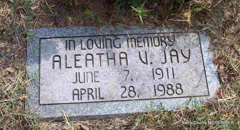 | JAY, Aleatha V. (BAILIE) | June 7, 1911 | Apr. 28, 1988 | Inscription: "In Loving Memory" - Research Note: Wife of Edward Orlin Jay. Daughter of John Washington Bailie and Avana Baxter. | Census Phyllis Long Photo Diana Cope |