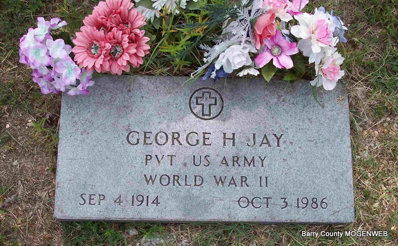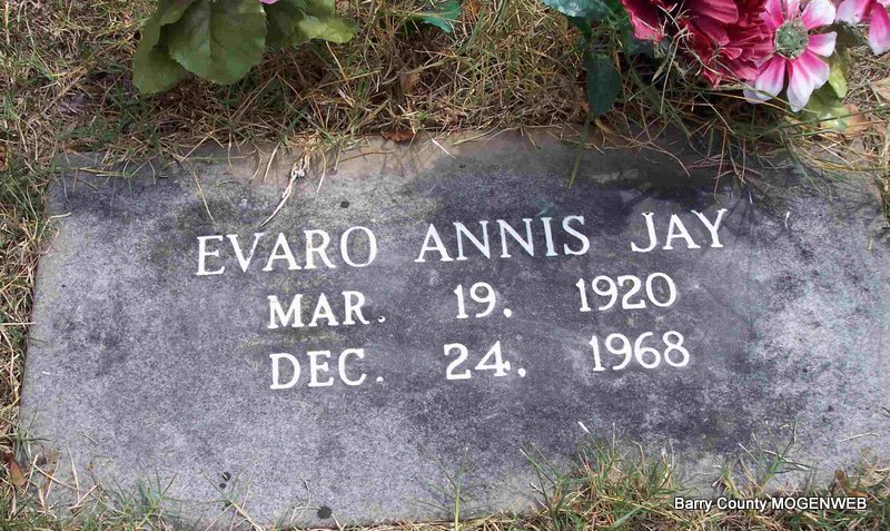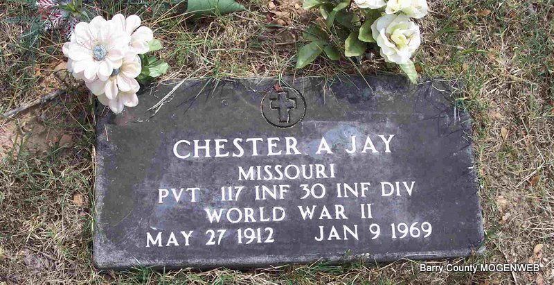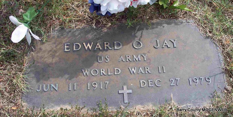 Inscription: "MISSOURI PVT 117 30 INF DIV WORLD WAR II" - Research Note: Aurora, Lawrence Co., MO resident. Son of Arthur Jay and Anne Thomas; widow of Evaro Annis Jay; he died as a result of injuries suffered in a car accident, in which his wife was killed, in Wright Co., MO. Arthur Jay of Aurora, MO was the informant on the death certificate. | Note Connie Schmidt Death Certificate Phyllis Long Photo Diana Cope |