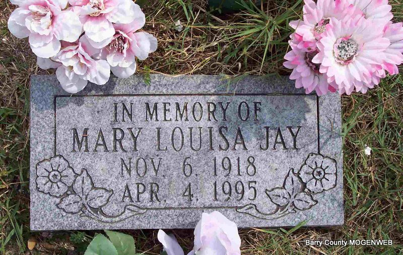 | JAY, Mary Louisa | Nov. 6, 1918 | Apr. 4, 1995 | Inscription: "In Memory Of" - Research Note: Wife of George Henry Jay. | Census Phyllis Long Photo Diana Cope |