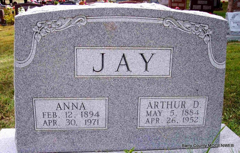 SSW: Anna - Research Note: Son of Lotman B. Jay and Mary A. Boyd. His wife, Anna, was the informant on the death certificate. - November 7, 1912, Cassville Republican - Arthur Jay of Jenkins, who was to have been tried here Thursday upon the charge of shooting a steer belonging to P. Maloney, was released on account of the prosecuting witness failing to appear. - Cassville Republican, Dec. 4, 1919 - Arthur Jay is moving in with his mother-in-law, Mrs. Kate Thomas of Leann. - Cassville Democrat, April 10, 1920 - Arthur Jay is going to move to Jenkins with his breeding stock this week. - | Death Certificate Online Newspapers Phyllis Long Photo Diana Cope |