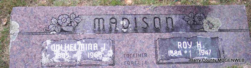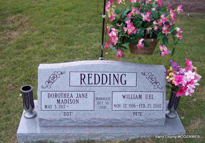 SSW: Dorothea Jane Madison - Inscription: "Married Oct. 16, 1937" - Research Note: 85 years old. Mr. Redding was a retired highway department worker. Son of Martin Samuel Redding and Jessie Margaret Hamilton. | Monett Times Feb. 26, 2002 Mary Homesley Photo Diana Cope |