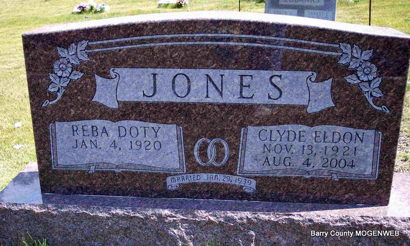 SSW: Reba Doty - Inscription: "Married Jan. 29, 1939" - Research Note: Mr. Clyde E. Jones, 82, of Stewartsville, MO, formerly of Springfield, MO, died Wednesday, Aug. 4, 2004, at the Missouri Veterans Home in Cameron, MO. Son of Benjamin and Ethel (Carney) Jones. He married the former Reba Doty. Clyde served his country with pride in the United States Air Force. After his military career, Mr. Jones worked as a business agent for Teamsters Local 41. - Clyde Jones, age 17, married Reba Doty, age 19, on Jan. 29, 1939 in Benton Co., AR. | Springfield News Leader AR Marriage Index Phyllis Long Photo Diana Cope |