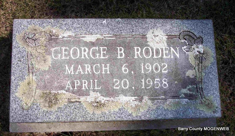 | RODEN, George Bennett | Mar. 6, 1902 | Apr. 20, 1958 | Research Note: Son of William Newton Roden and Amma R. Henson. Great Grandson of James Roden and Nancy Matilda Fly. George, age 24, first married Doris R. Adams on Apr. 24, 1926 in Phelps Co., MO. At age 44, he married Iva A. Tucker, age 55 on Dec. 8, 1946 in Rolla, Phelps Co., MO. | Census MO Marriage Records Phyllis Long Photo Diana Cope |