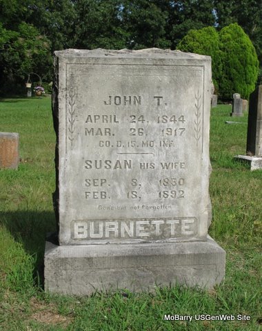 SSW: Susan - Inscription: "CO. D. 15 MO INF. - Gone But Not Forgotten" - Research Note: He was a son of Wilson Cornelius and Mary (Liggett) Burnette, and the husband of Susan Ellen (Masoner) Burnette. The family has that he was born in 1845 and not 1844 as the stone reads. - Cassville Democrat, Mar. 31, 1917 - John Burnett, a prominent citizen and old soldier died at his son Bill's on Trent Creek, Monday afternoon (Mar. 26th). His son Elbert came in from Oklahoma on Tuesday. John served in the War between the States as a Federal in Company D., 15th Missouri Infantry. He enlisted on 22 Sept. 1862 and was honorably discharged at Victory, Texas in Oct., 1865. He was born Apr. 24, 1845 in Platte Co., MO and was a son of Wilson Cornelius and Mary (Liggett) Burnett. He married Susan Ellen (Masoner) Burnett 1866 in Platte Co., MO. She was the daughter of George and Agnes (Lauderdale) Masoner, Jr. John Burnett served as a Union soldier during the Civil War. In his military papers there were statements about different events of the war. He stated that the one of the things he witnessed at the Battle of Spring Hill was a man who had lost both arms carrying a bucket of water with his teeth to a dying comrade. - Another Photo | Online Obit Donna Cooper Photo Jack Fly Photo Ralph & Betty Lamberson |