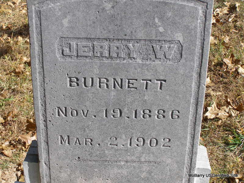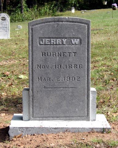 Research Note: He was a son of John Talbert and Susan Ellen (Masoner) Burnette. His stone was damaged by vandals and was restored by Jack Fly. His father's stone has Burnette spelled with an "e" and his stone has Burnett without the extra "e". The family has death date as Mar. 12, 1902 not Mar. 2, 1902 as the stone reads. - Another Photo | Note Donna Cooper Photo Jack Fly Photo Ralph & Betty Lamberson |