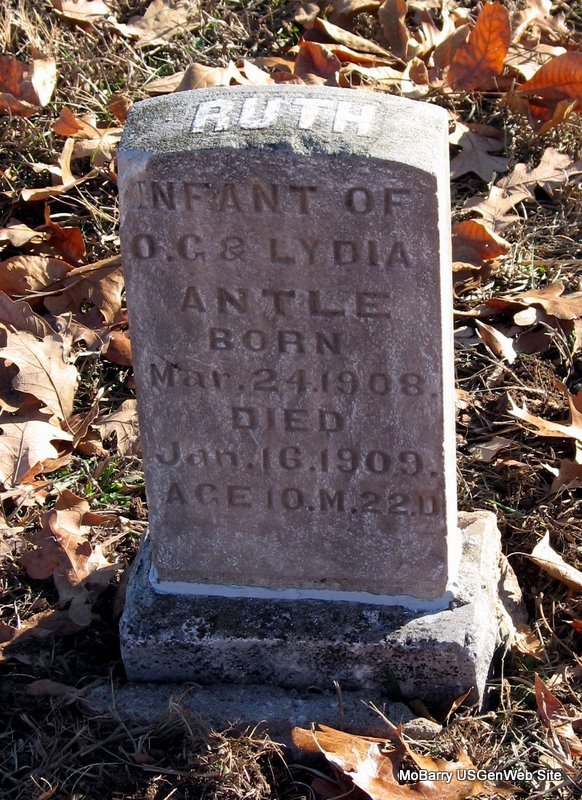 | ANTLE, Ruth | Mar. 24, 1908 | June 16, 1909 | Inscription: "Infant of O. G. and Lydia Antle - Age 10 M. & 22 D." - Research Note: Daughter of Oliver G. Antle and Lydia Montgomery. | Note Phyllis Long Restoration Photo Jack Fly |