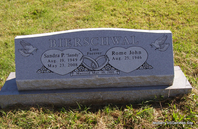 | BIERSCHWAL, Rome John | Aug. 25, 1946 | No Date | SSW: Sandra P. - Inscription: "Married Mar. 10, 1980" - Research Note: Rome John Bierschwal, age 18, first married Sharon Kay Howland, age 15, on Aug. 1, 1965 in Jennings, St. Louis Co., MO. They were both from Granite City, Madison Co., IL. Rome's mother, Ruby Bierschwal, gave consent. John Howland, father of Sharon Kay, gave consent. | MO Marriage Records Headstone Phyllis Long Photo Ralph & Betty Lamberson |
