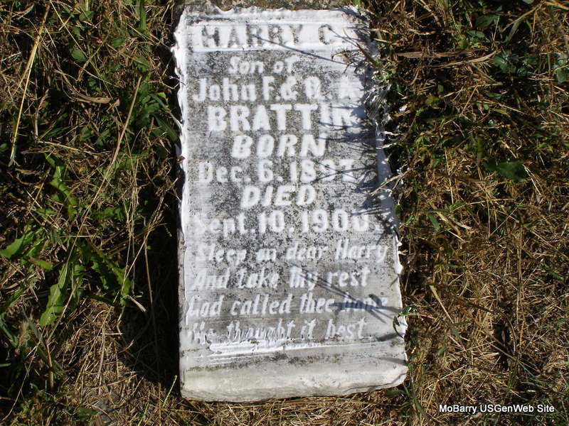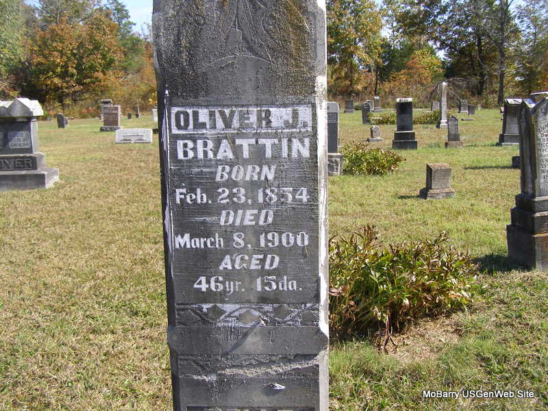 | BRATTIN, Oliver Jessie | Feb. 23, 1854 | Mar. 8, 1900 | SSW: Belle - Inscription: "46 yrs. 15 days" - Research Note: He was a son of Henry Monroe Brattin and Sarah (Bowman) Brattin. Betty's Research Note: Oliver Jesse Brattin, son of Monroe Brattin, an early settler of Liberty Township and an early member of Concord Cumberland Presbyterian Church. He was the father of Georgia Edna. Phyllis' Note: There was also a son Walter with whom Belle was living in the 1910 Census. Charles Oliver and Rosabelle Brattin are Betty Lamberson's great-grandparents. - El Paso News: Oliver J. Brattin, departed this life, Thursday, March 8, at 10:30 o'clock p. m. of brain fever. Mr. Brattin had been a resident of Barry County for several years and was a prominent member of the Presbyterian Church. He leaves a widow, three children, and many friends and relatives to mourn his loss. The funeral was preached in the church by Rev. Gurley of Purdy. The remains were interred in the Concord Cemetery Friday. - Another Photo | Online Obit Beverly Matthews Note Photo Ralph & Betty Lamberson Photo Frances Albert |