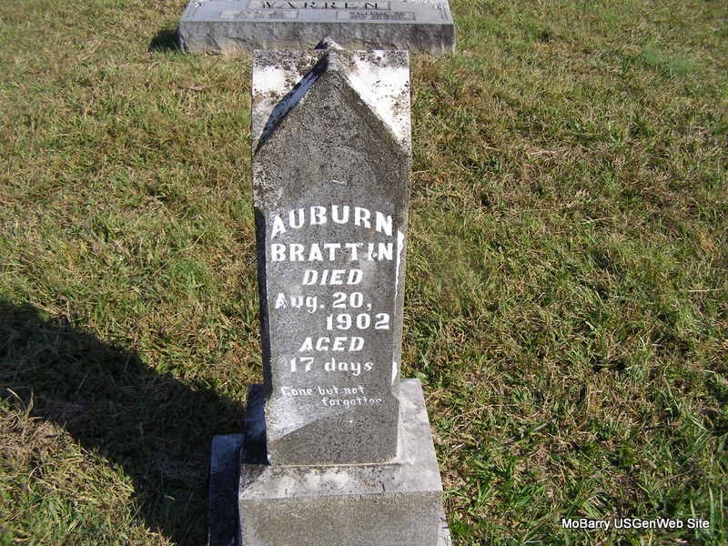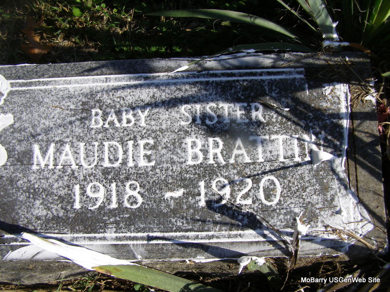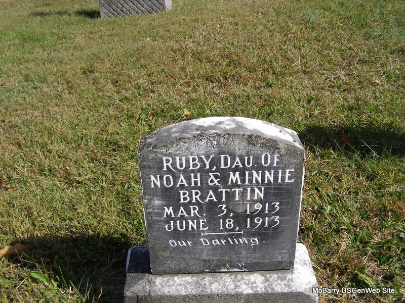 | BRATTIN, Ruby | Mar. 3, 1913 | June 18, 1913 | Inscription: "Dau. of Noah and Minnie - Our Darling" - Another Photo | Headstone Beverly Matthews Photo Frances Albert Photo Ralph & Betty Lamberson |