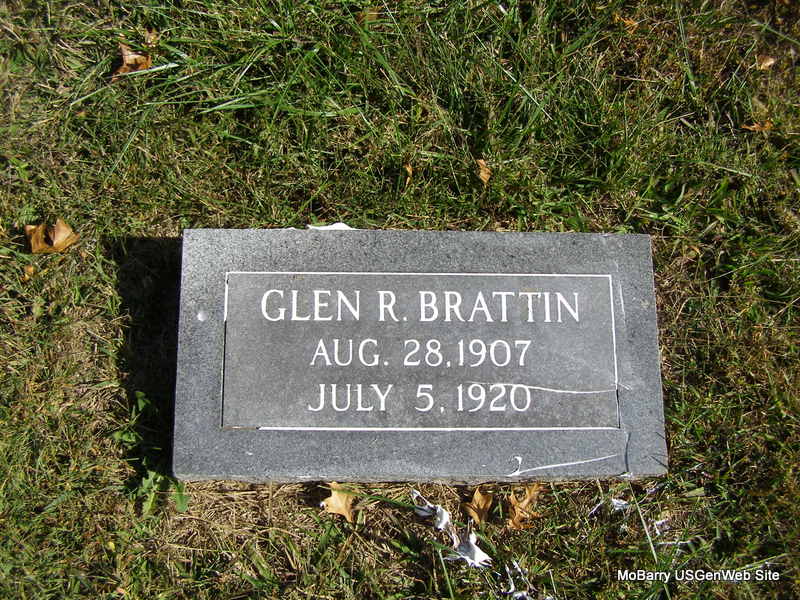 | BRATTIN, Glen R. | Aug. 28, 1907 | July 5, 1920 | Research Note: Son of William Horace Brattin and Minnie E. Wilkerson. - Cassville Democrat,, July 10, 1920 - Glenn, 12 year son of Mr. and Mrs. Horace Brattin of Liberty township, died early Monday morning of a bowel trouble. Funeral was conducted that afternoon and interment was made in Concord Cemetery. - Another Photo | Online Newspapers Phyllis Long Headstone Beverly Matthews Photo Frances Albert Photo Ralph & Betty Lamberson |
