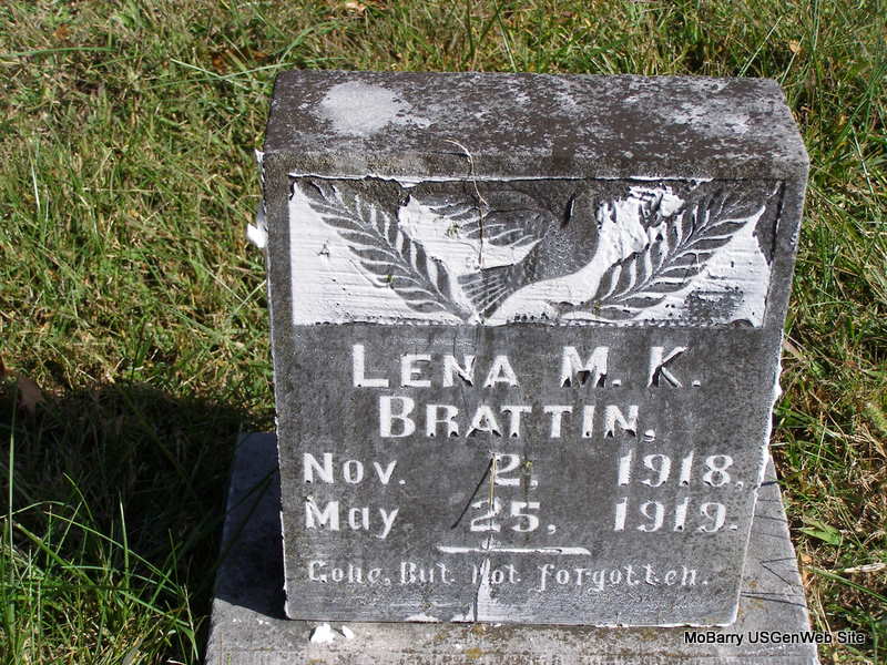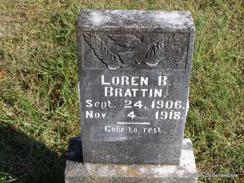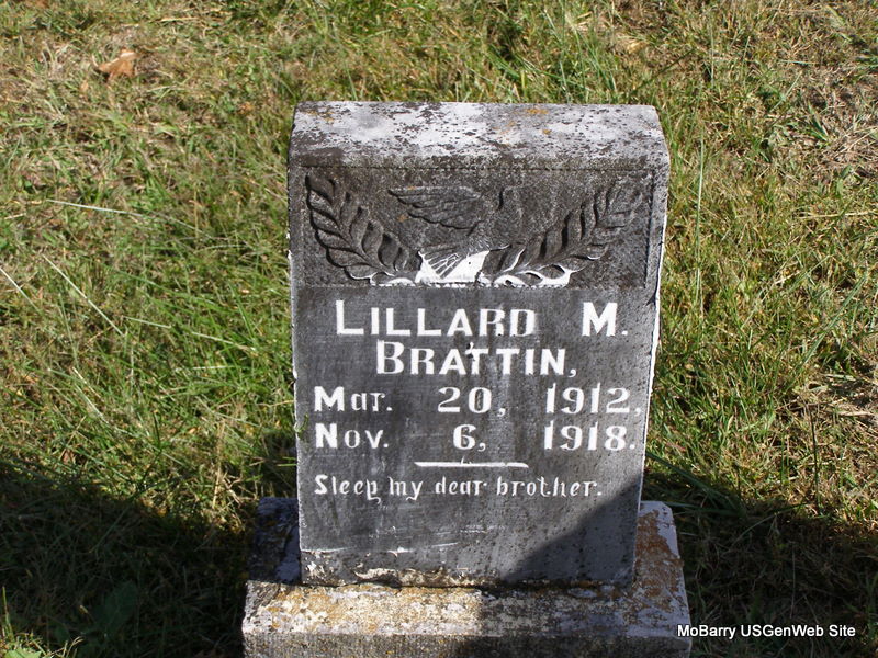 Inscription: "Gone to Rest" - Research Note: He was a son of Colon E. and Lena Mae (Montgomery) Brattin. - Cassville Republican,, Nov. 14, 1918 - Mrs. Edgar Brattin and two children died last week at their home near Wheaton of influenza. Three deaths in one family in a single week was indeed very sad. - Another Photo | Online Newspapers Phyllis Long Family Photo Frances Albert Photo Ralph & Betty Lamberson |