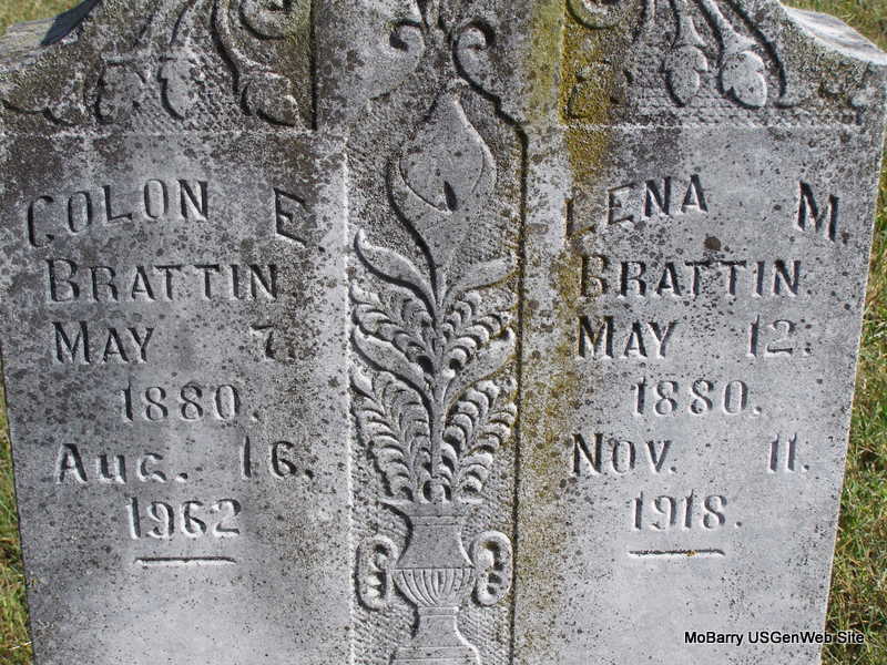 SSW: Lena M. - Inscription: "Waiting for Loved Ones" - Research Note: Colon was the son of Thomas Haywood Brattin and Sallie Peach. Elvin Brattin of Exeter, MO was the informant on the death certificate. - Another Photo | Death Certificate Phyllis Long Family Data Photo Frances Albert Photo Ralph & Betty Lamberson |