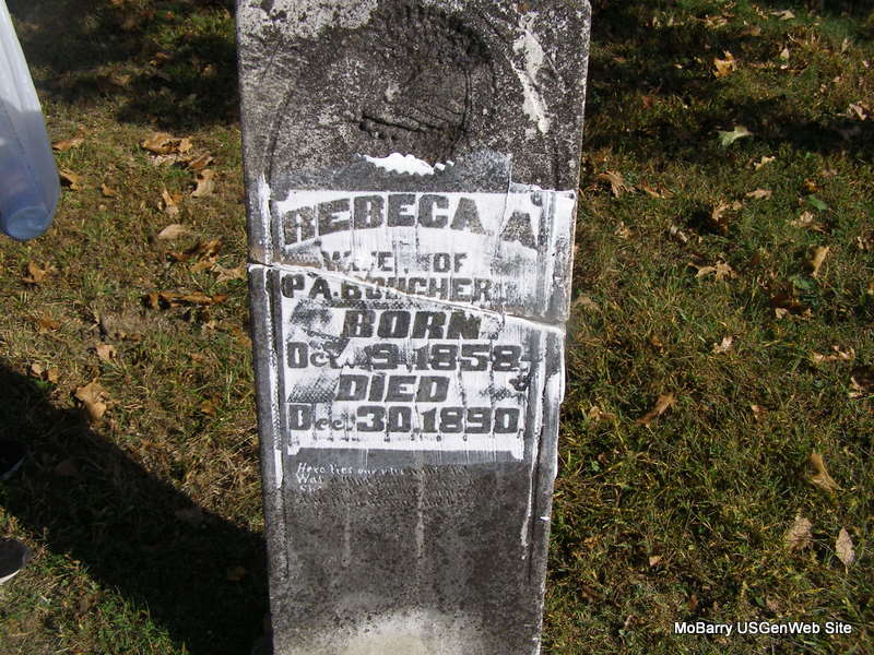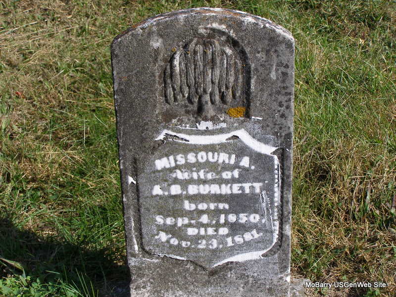 | BURKETT, Missouri A. (McGLOTHLIN) | Sept. 4, 1850 | Nov. 23, 1881 | Inscription: "Wife of A. B. Burkett" - Research Note: Daughter of Isaac B. McGlothlin and Sarah Brattin. Missouri McGlothlin married Brown Burkett on May 11, 1873 in Barry Co., MO. | MO Marriage Records Census Phyllis Long Photo Ralph & Betty Lamberson |