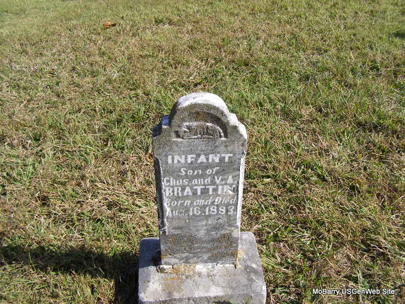 | BRATTIN, Infant Son | Aug. 16, 1883 | Aug. 16, 1883 | Inscription: "Born & Died Aug. 16, 1883 - Son of Chas. and V. A. Brattin" - Research Note: Son of Charles B. Brattin and Vestie A. Goostree. - Another Photo | Family Data Photo Frances Albert Photo Ralph & Betty Lamberson |