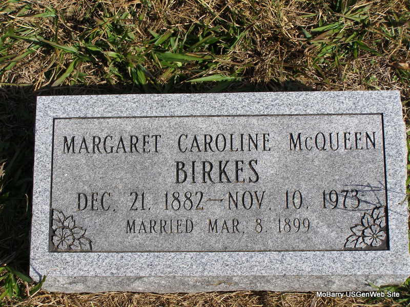 Inscription: "Married Mar. 8, 1899" - Research Note: Charles O. Birkes, age 22, married Maggie McQueen, age 16, on Mar. 8, 1899 in Barry Co., MO. - Services for Mrs. Maggie C. Birkes, 90, Exeter route 1, who died at 11:30 pm Saturday at south Barry County Hospital, Cassville, where she had been admitted a few hours earlier, will be at 2 p.m. Tuesday at the Ridgley Baptist Church, south of Wheaton. Mrs. Birkes was born Dec. 21, 1882, in the State of Virginia. She lived most of her life in Barry County and was a member of Ridgley Baptist Church. She married Charles O. Birkes March 8, 1899 and he died Nov 26, 1949. Survivors include two sons, Chester Birkes, Independence,and Hershel Birkes, Exeter route 1; two additional daughters, Mrs. Mildred Springer, Marionville, and Mrs. Lora Embrey, Appleton City; a sister, Mrs. Hattie Thomas, Exeter; 10 grandchildren, 25 great-grandchildren. | MO Marriage Records Joplin Globe Phyllis Long Photo Ralph & Betty Lamberson |