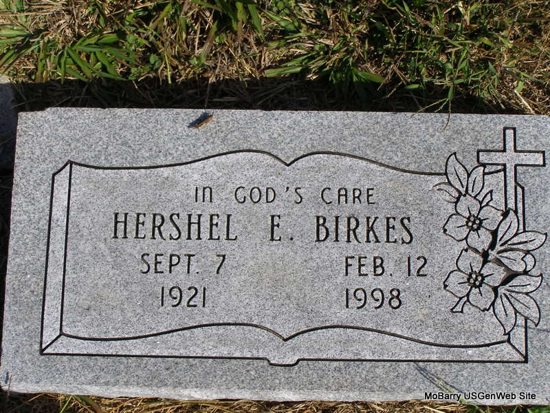 Inscription: "In God's Care" - Research Note: Hershel Birkes, 76, Exeter, died at 7:45 a.m. Thursday, Feb. 12, 1998, at a Joplin nursing home after a long illness. Mr. Birkes was born Sept. 7, 1921, in the Ridgley community near Exeter. He was a lifelong Exeter-area resident. He was a self-employed farmer and cattleman. He was a member of Ridgley Baptist Church. Survivors include two sisters, Mildred Springer, Marionville and Lora Embrey, Appleton City. Son of Charles Orestes Birkes and Margaret Carolyn "Maggie" McQueen. | Joplin Globe Phyllis Long Photo Ralph & Betty Lamberson |