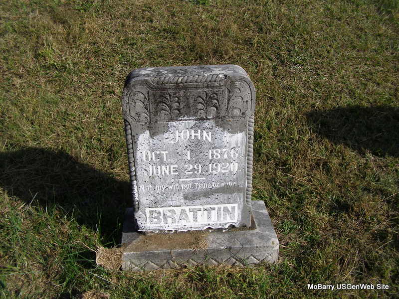 Research Note: He was a son of John Franklin and Quincy A. (Lamberson) Brattin. Mahala Cole of Neosho, MO was the informant on the death certificate. - May 11, 1911, Cassville Republican - Exeter News: Mose Brattin of Carterville is visiting his mother, Mrs. Quincy Brattin, this week. - May 3, 1917, Cassville Republican - Deputy Sheriff Walter Vanzandt was called to Exeter Tuesday morning by a disturbance being caused there by Moses Brattin who was intoxicated. He was placed under arrest by Mr. Vanzandt and gave bond for his appearance before the justice of the peace at Exeter. - Cassville Republican, April 18, 1918 - Mose Brattin, James Lawson and Alva Rhine tanked up on booze and raised trouble at Exeter Wednesday afternoon of last week. They were all arrested by Sheriff Houston and paid fines and costs. | Death Certificate Online Newspapers Phyllis Long Headstone Beverly Matthews Family Data Frances Albert Photo Ralph & Betty Lamberson |