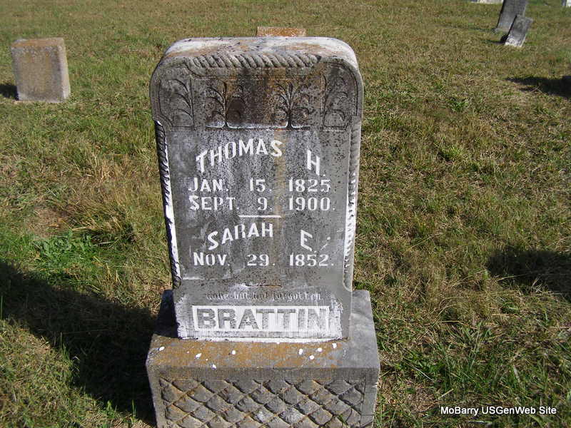 | BRATTIN, Thomas Haywood | Jan. 15, 1825 | Sept. 9, 1900 | SSW: Sarah E. - Inscription: "Gone But Not Forgotten" - Research Note: Civil War Veteran. Researchers say he was a son of John and Susannah (Burton) Brattin. - Another Photo | Note Phyllis Long Photo Frances Albert Photo Ralph & Betty Lamberson |